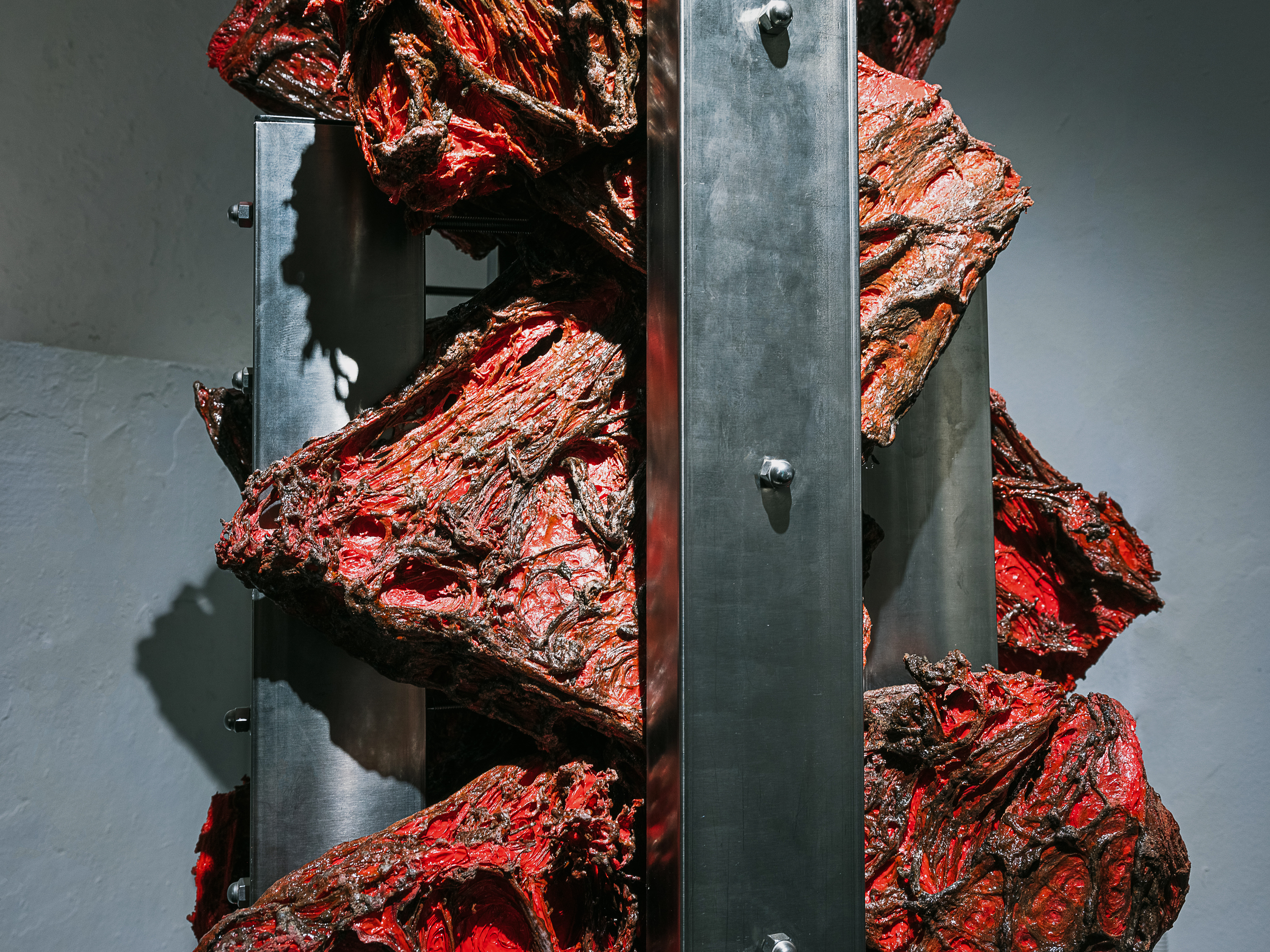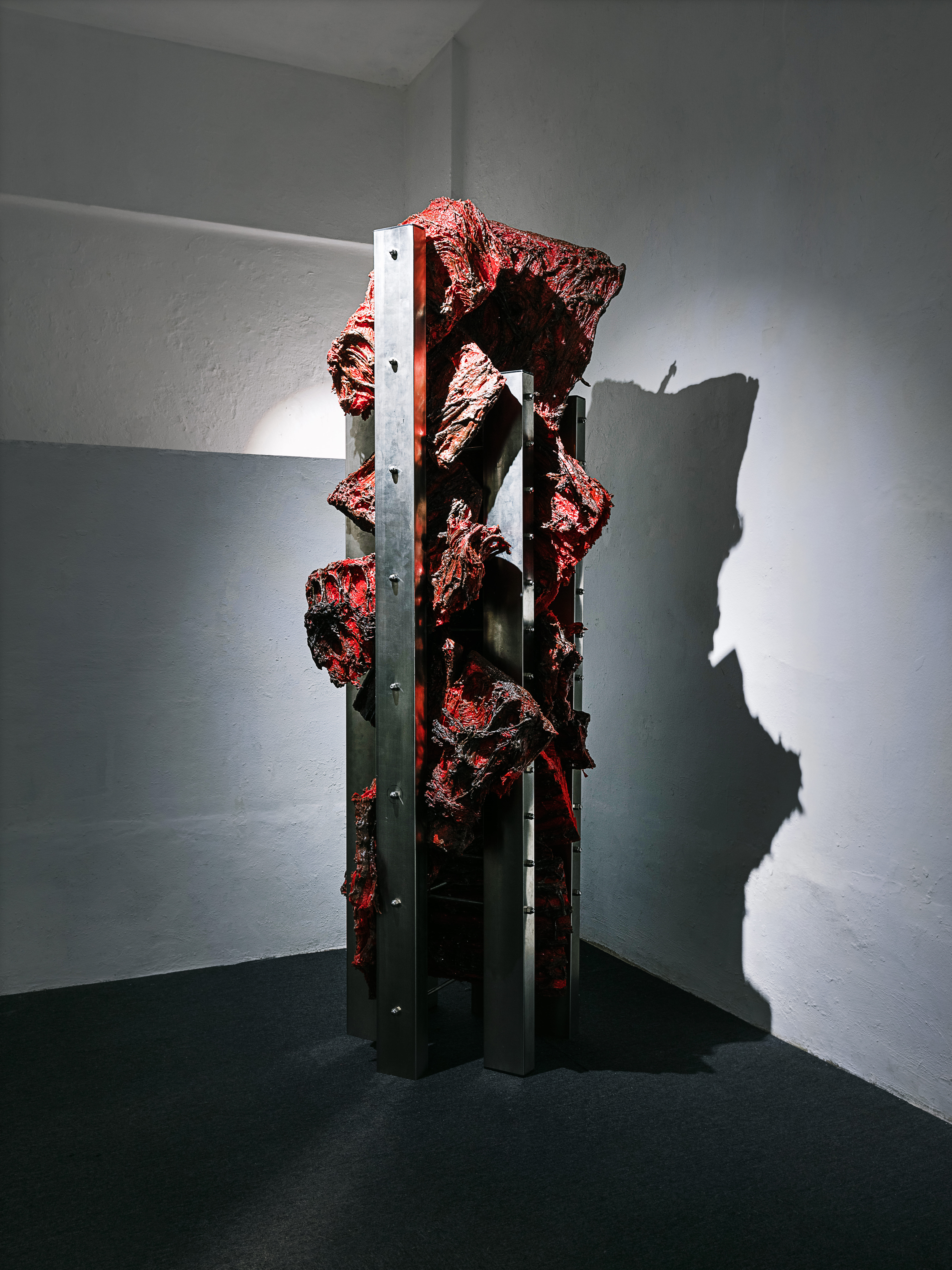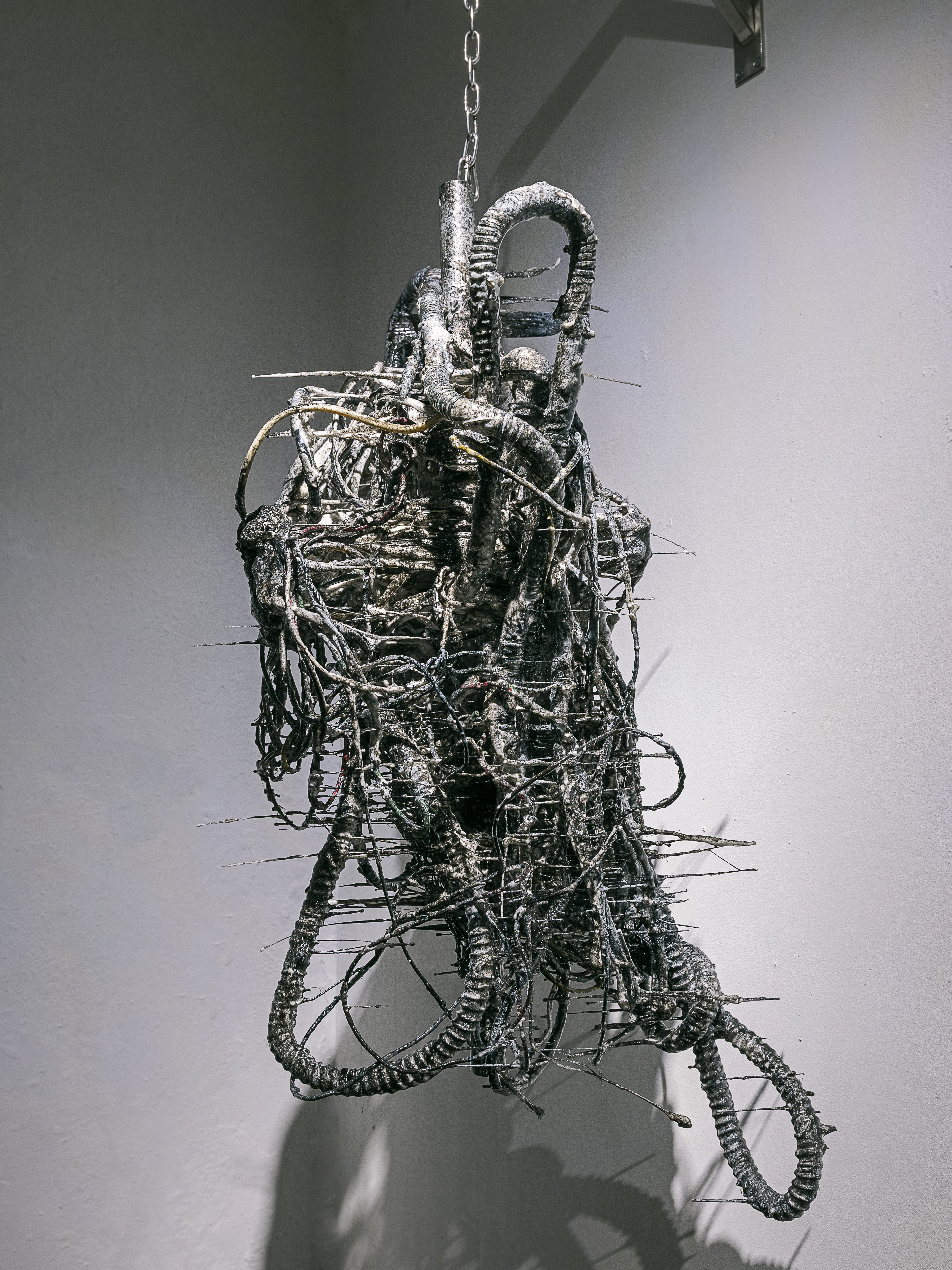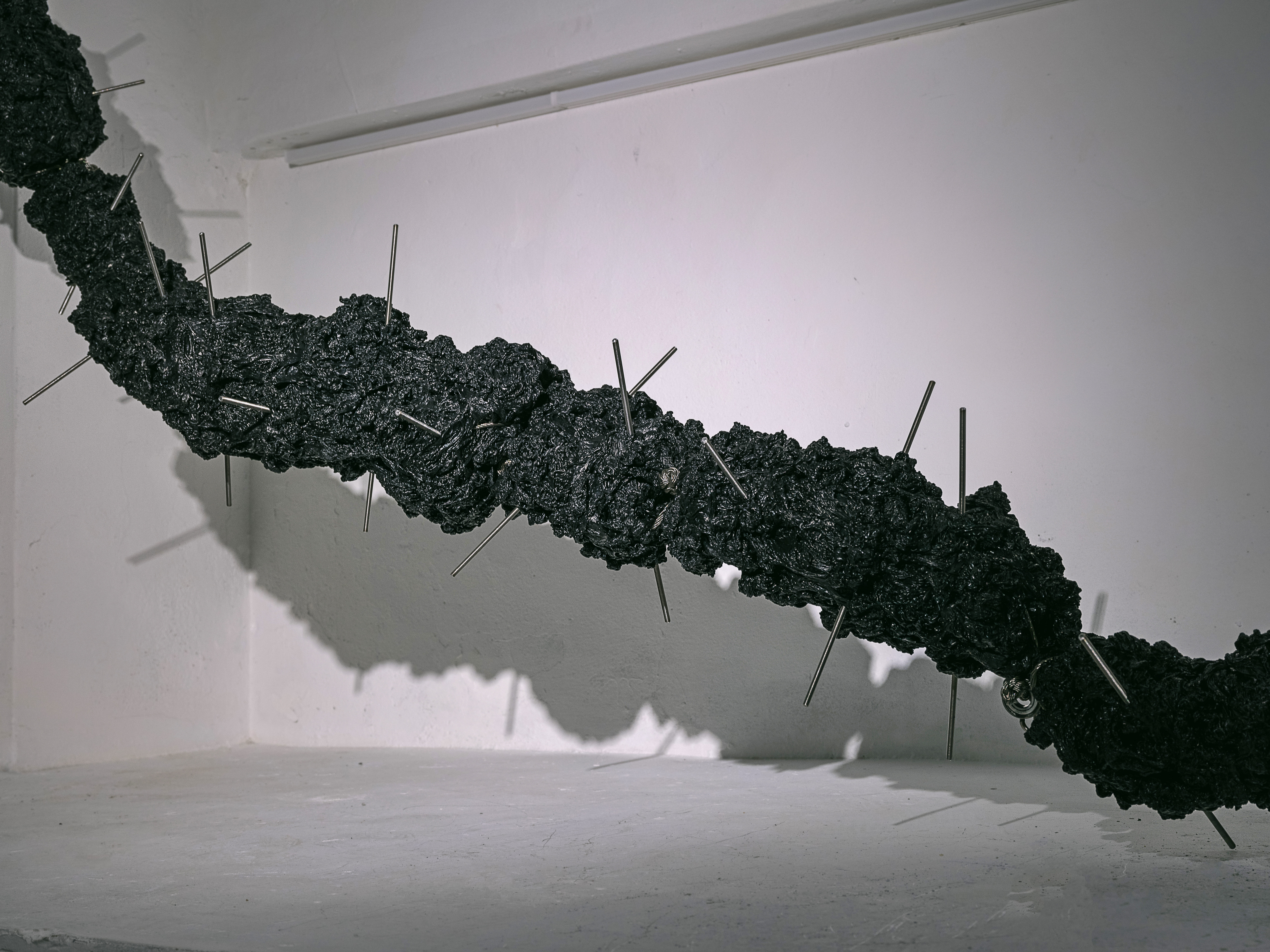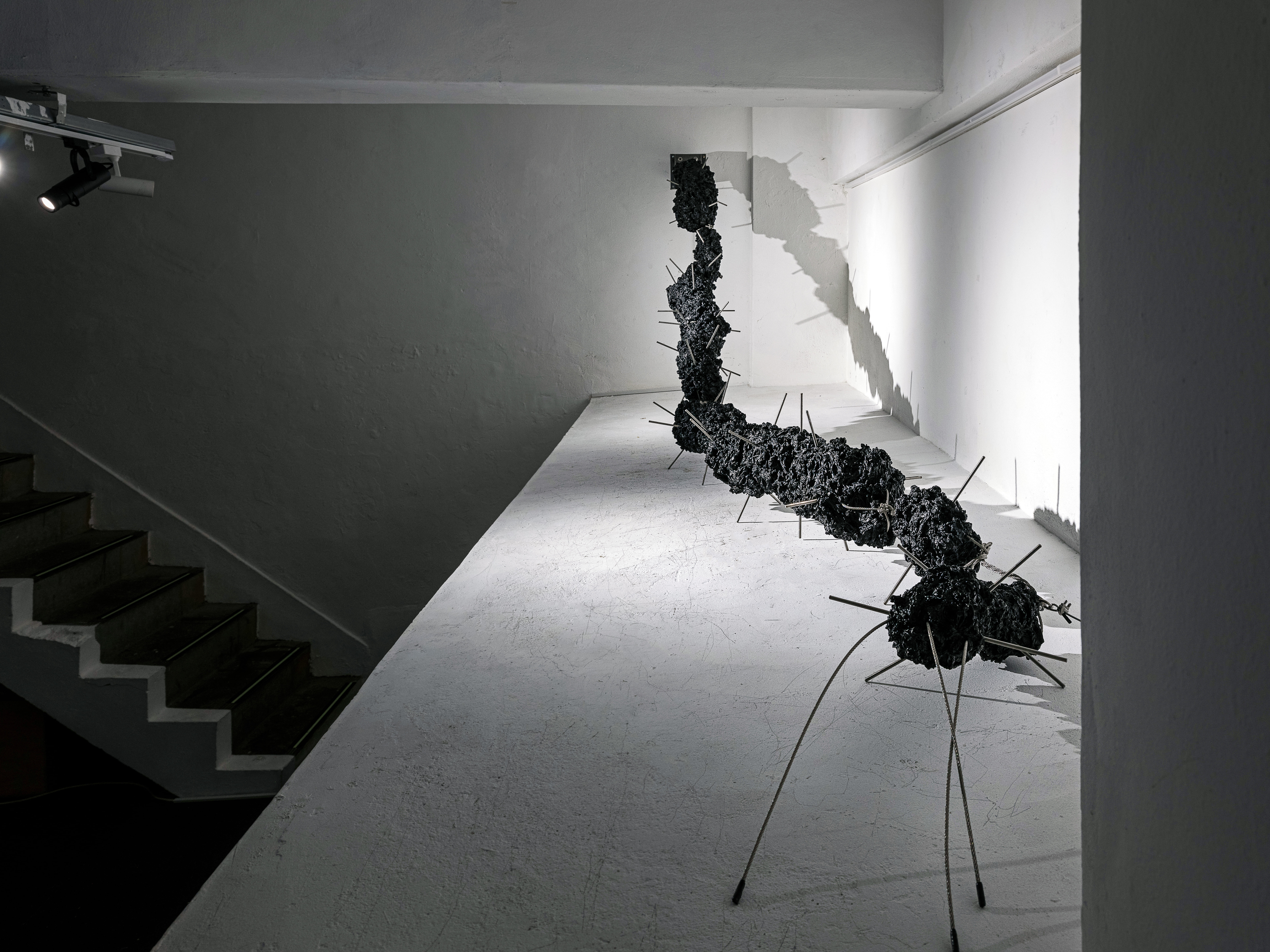 Sijae Jang’s sculptural body serves as a wormhole—a backdoor—into parallel fictions. This body, created by the conjoining and transplantation of functional industrial materials, is either a hybrid organism conceived through the fusion of such materials or an organic body arising from xenogenesis between inorganic industrial components. The spaces between the fantasies Jang deconstructs enable us to traverse the gaps between distinct linguistic realities. These spaces embody the void between languages—the emptiness that, as previously mentioned, is an abyss of death. From this grotesquely conjoined sculptural body, we are drawn toward the real. This experience evokes a fear or trauma arising from the voids in language: traversing universes, molecules, and the strong forces between particles—synthetic resin, synthetic cosmos, synthetic bodies. These elements constitute the structural hallmark of Sijae Jang‘s sculptural body.